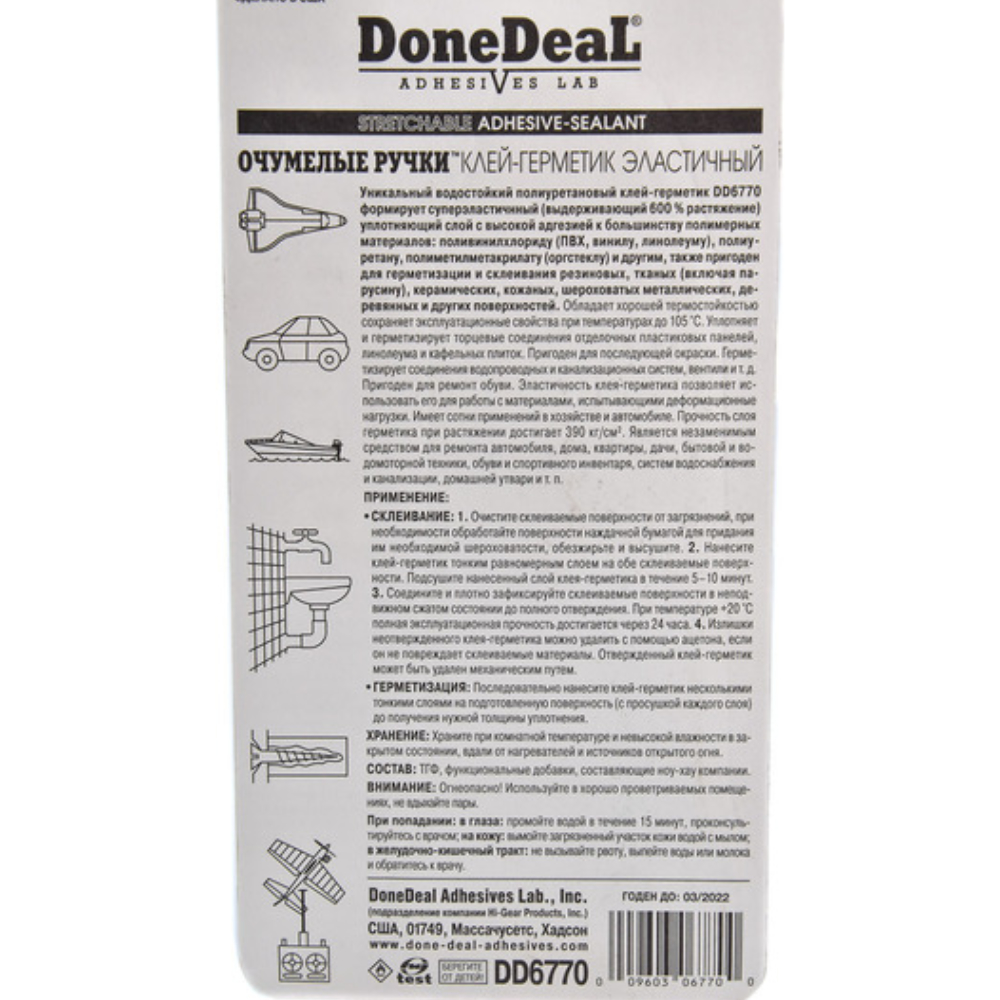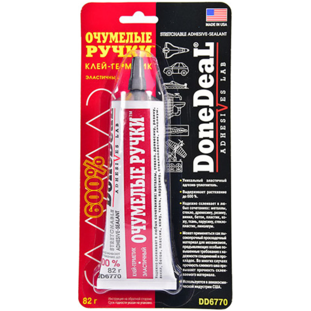 Эластичный клей-герметик "Очумелые ручки" (82 г.) Done Deal DD6770. Уникальный, не имеющий аналогов эластичный адгезив-уплотнитель, выдерживающий растяжение до 600%. Является незаменимым средством для ремонта автомобиля, дома, квартиры, дачи, служебного помещения, бытовой и водо-моторной техники, обуви и спортивного инвентаря, систем водоснабжения и канализации, домашней утвари и т.п. Уникальный водостойкий полиуретановый клей-герметик формирует суперэластичный (выдерживающий 600% растяжения) уплотняющий слой с высокой адгезией к большинству полимерных материалов.