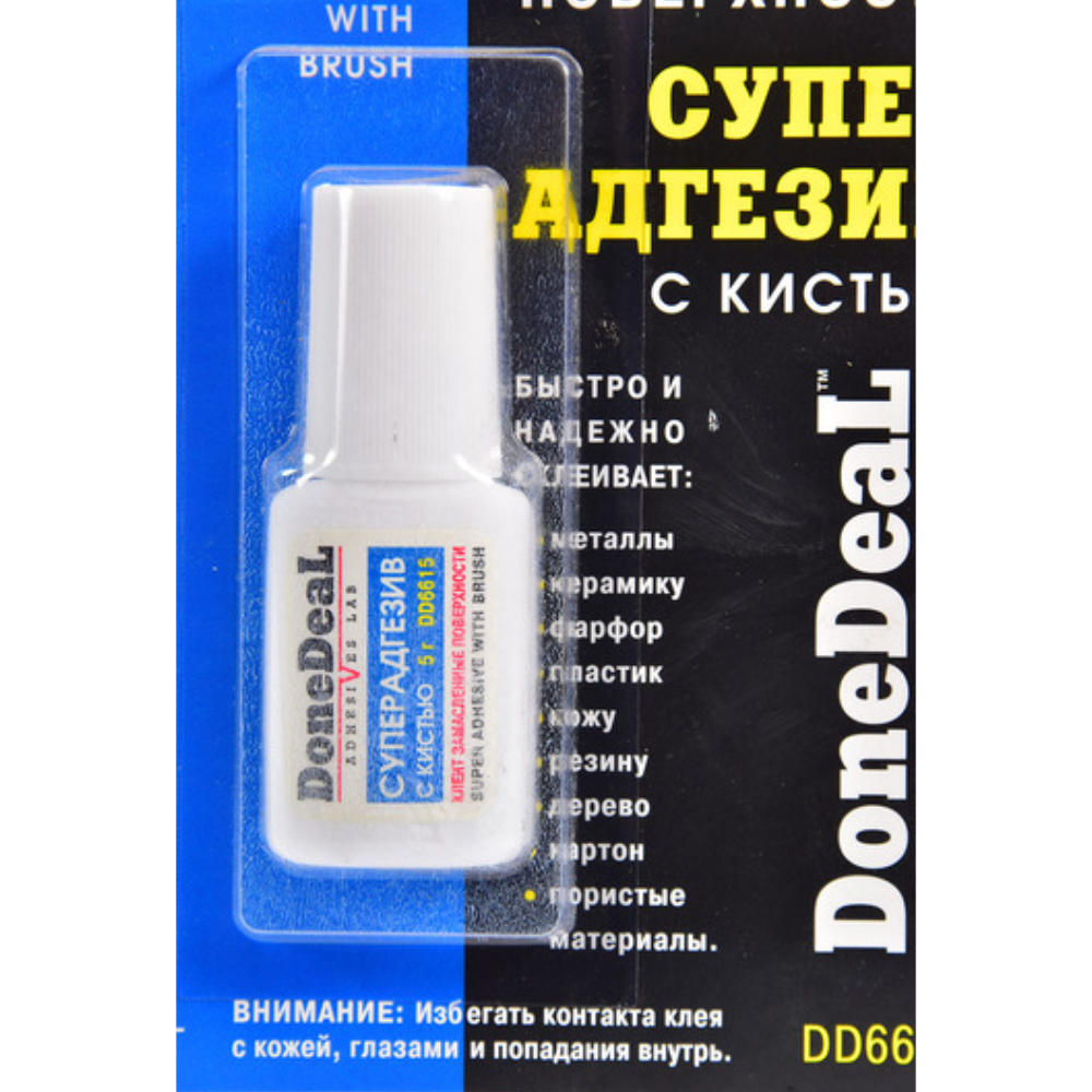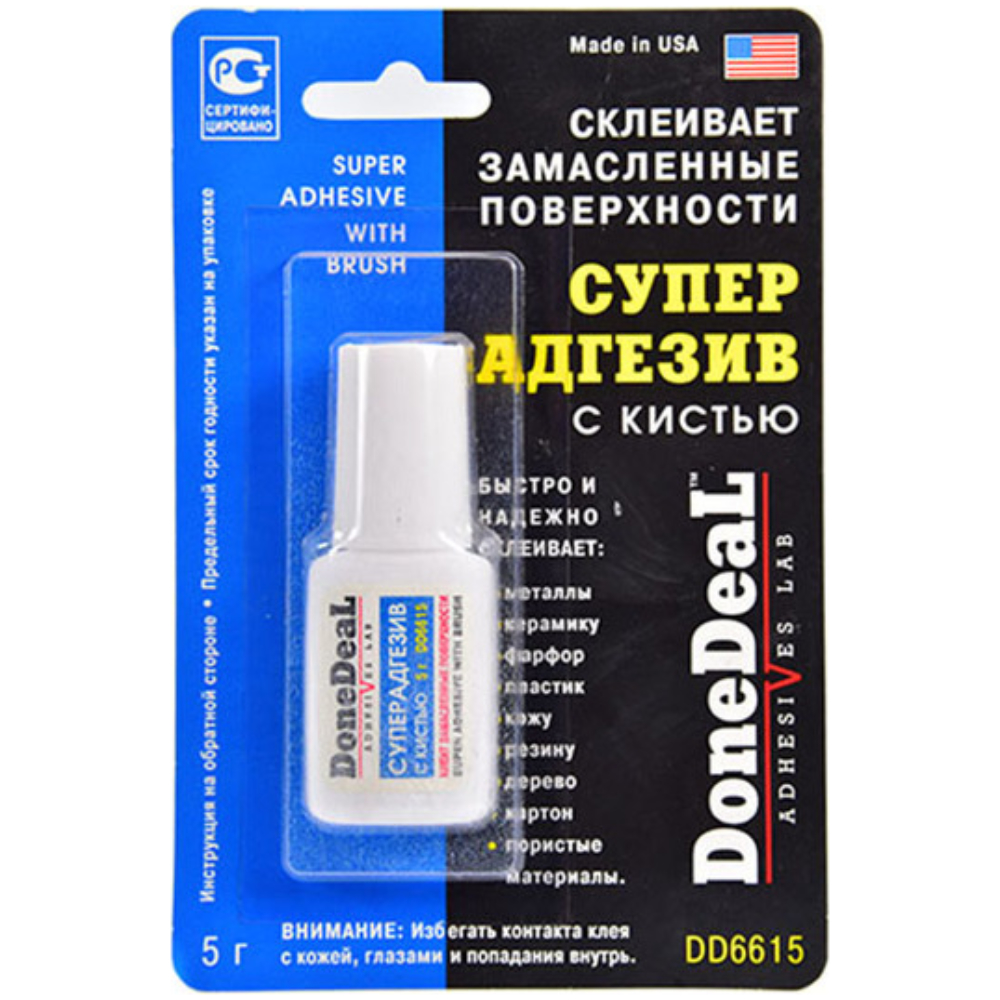 Суперадгезив с кистью (5 г) Done Deal DD6615. Новейшая разработка суперадгезива. Склеивает замасленные и загрязненные поверхности. Суперадгезив с кистью обладает хорошей адгезией к замасленным, загрязненным и пористым поверхностям. Не стекает.