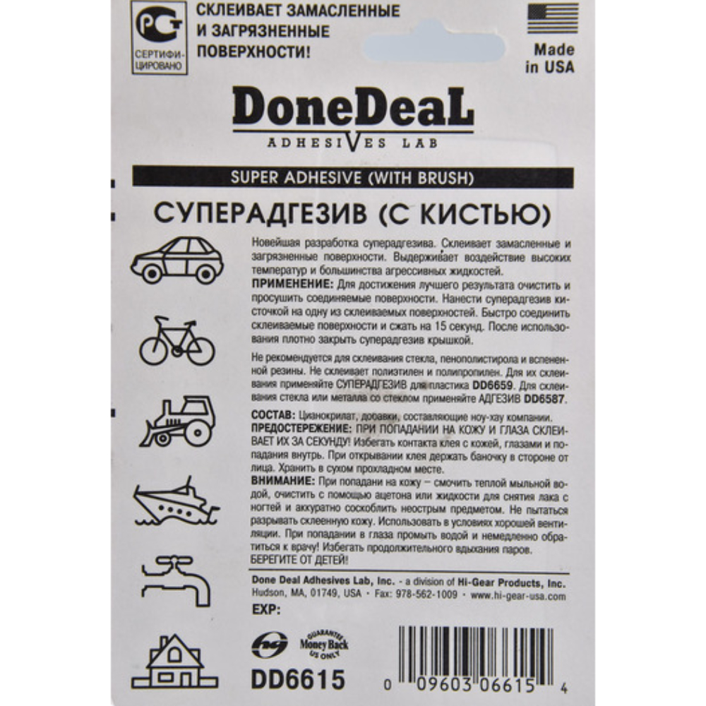 Предостережение. DD6615 - ПРИ ПОПАДАНИИ НА КОЖУ И ГЛАЗА СКЛЕИВАЕТ ИХ ЗА СЕКУНДУ! Избегать контакта клея с кожей, глазами и попадания внутрь. При открывании клея направляйте носик тюбика в сторону от лица. При попадании на кожу смочить теплой мыльной водой, очистить с помощью ацетона или жидкости для снятия лака с ногтей и аккуратно соскоблить не острым предметом. Не пытаться разрывать склеенную кожу. Использовать в условиях хорошей вентиляции. При попадании в глаза промыть водой и немедленно обратиться к врачу! Избегать продолжительного вдыхания паров клея. БЕРЕГИТЕ ОТ ДЕТЕЙ!
