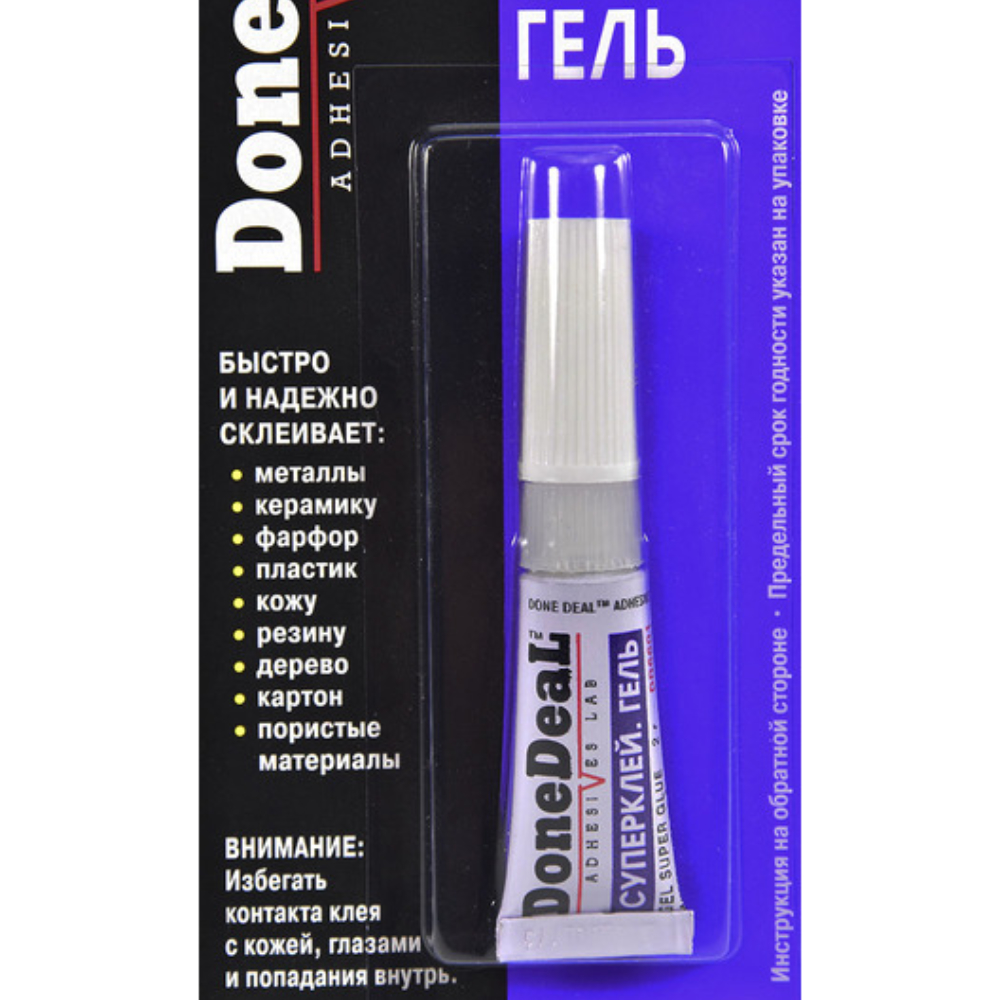 Суперклей гель (2 г) Done Deal DD6601. Универсальный цианакрилатный клей (суперклей) в форме геля для склеивания различных материалов, обладающий высокими тиксотропными свойствами (не стекает с вертикальных поверхностей). Универсальный суперклей, предназначенный для быстрого и надежного склеивания различных материалов. Обладает высокой прочностью.
