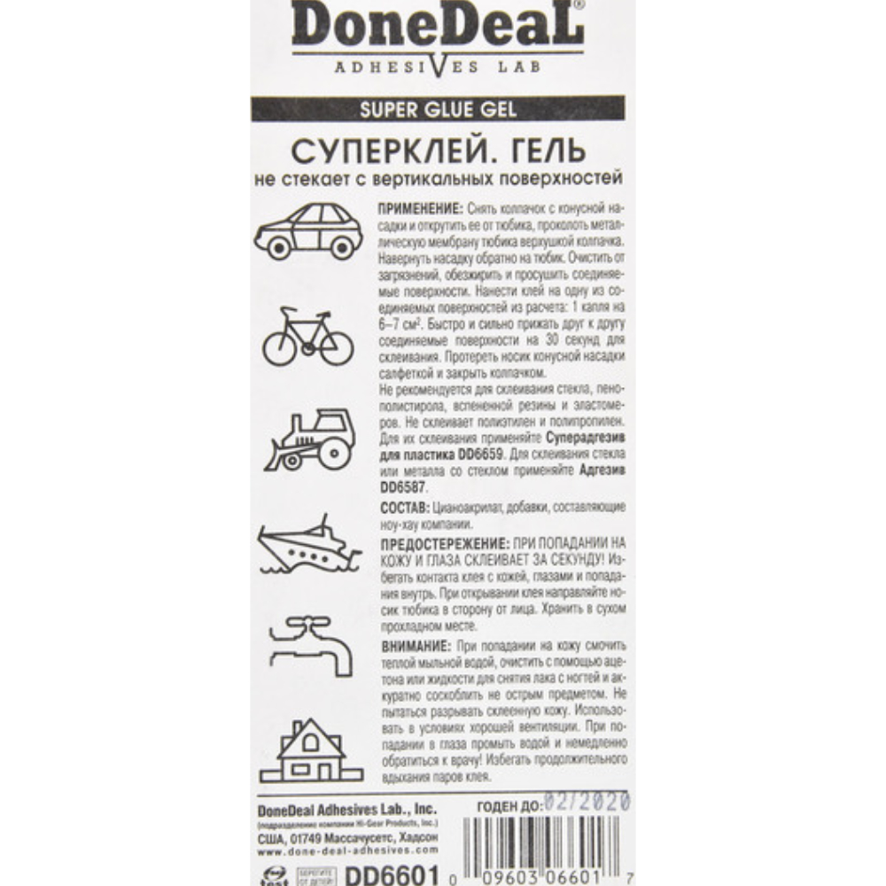Предостережение. DD6601 - ПРИ ПОПАДАНИИ НА КОЖУ И ГЛАЗА СКЛЕИВАЕТ ИХ ЗА СЕКУНДУ! Избегать контакта клея с кожей, глазами и попадания внутрь. При открывании клея направляйте носик тюбика в сторону от лица. При попадании на кожу смочить теплой мыльной водой, очистить с помощью ацетона или жидкости для снятия лака с ногтей и аккуратно соскоблить не острым предметом. Не пытаться разрывать склеенную кожу. Использовать в условиях хорошей вентиляции. При попадании в глаза промыть водой и немедленно обратиться к врачу! Избегать продолжительного вдыхания паров клея. БЕРЕГИТЕ ОТ ДЕТЕЙ!