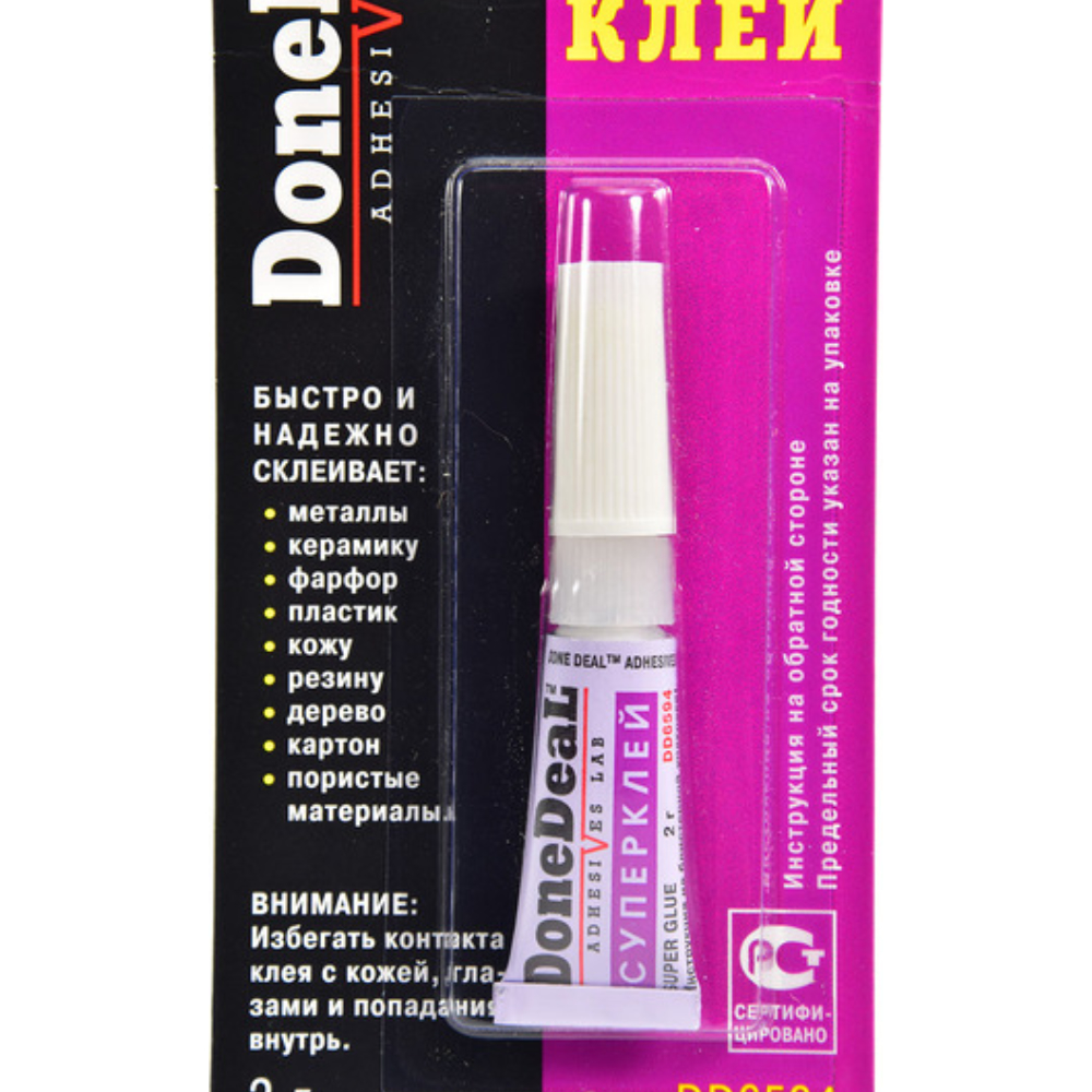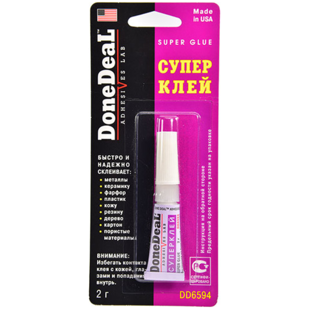Суперклей (2 г) Done Deal DD6594. Универсальный цианакрилатный клей (суперклей) для склеивания различных материалов, обладающий высокими тиксотропными свойствами (не стекает с вертикальных поверхностей). Универсальный суперклей, предназначенный для быстрого и надежного склеивания различных материалов. Обладает высокой прочностью.