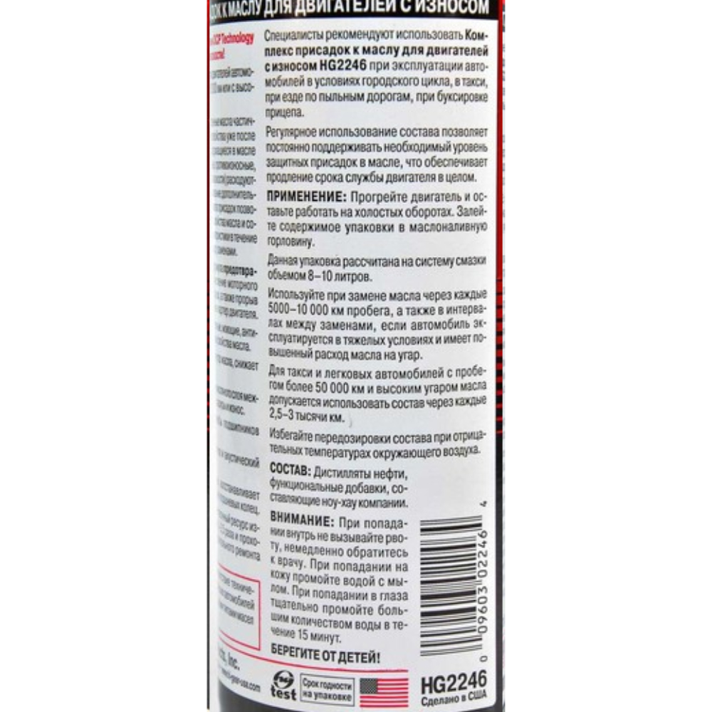 Комплекс присадок к маслу Hi-Gear HG2246 предназначен для автомобилей с пробегом более 50 000 км. или с высоким "угаром" масла. Даже самые высококачественные масла частично теряют свои свойства уже после 2-3 тисяч км. пробега. Содержащиеся в масле присадки (антиокислительные, противозадирные, антипенные, стабилизирующие вязкость) расходуются неравномерно. Использование дополнительного сбалансированного пакета присадок позволяет значительно улучшить свойства масла и сохранить его защитные свойства в течение всего периода между заменами масла. специалисты рекомендуют использовать этот комплекс присадок к маслу при эксплуатации автомобилей в условиях городского цикла, в такси, при езде по пыльным дорогам, при буксировке прицепа. Регулярное использование Hi-Gear HG2246 позволяет постоянно поддерживать необходимый уровень защитных присадок в масле ,что обеспечивает продление срока службы двигателя в целом