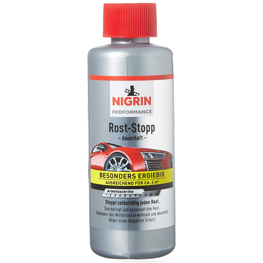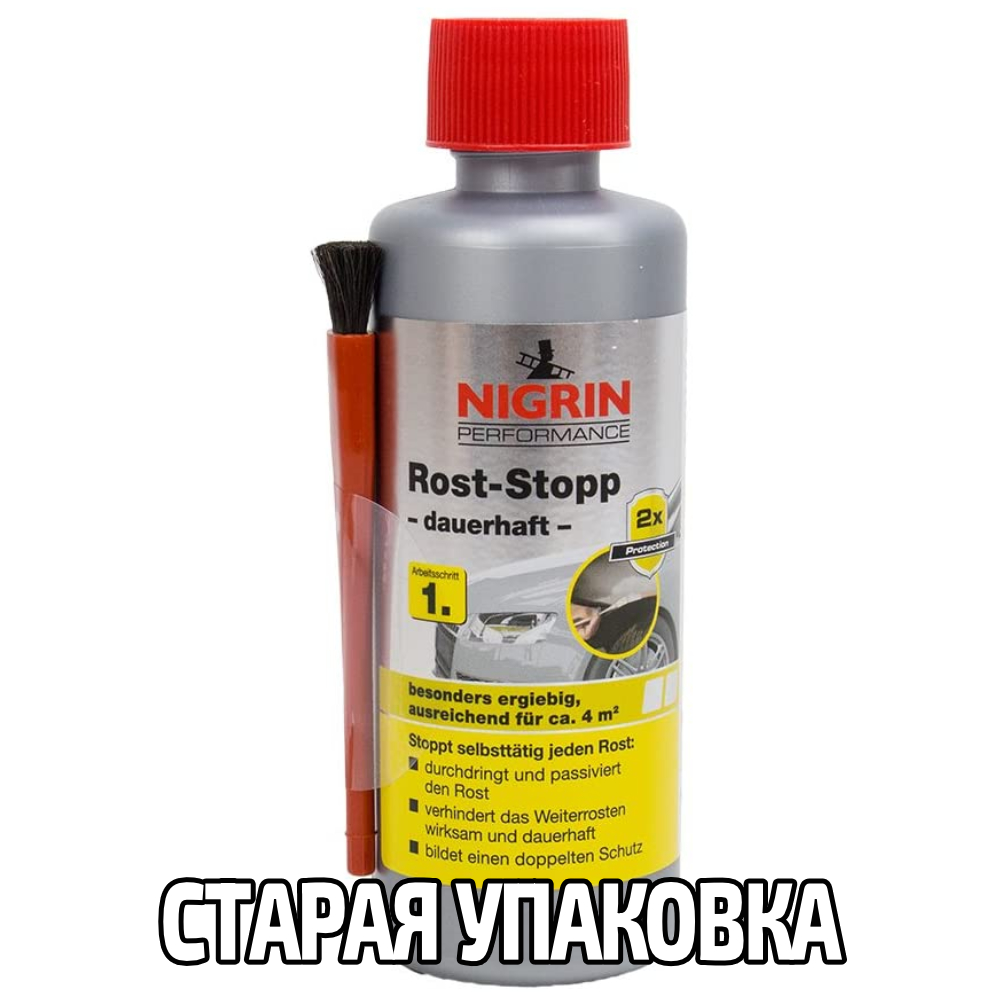 Немецкий высокоэффективный экономный быстрый 3-часовой удалитель ржавчины с индикатором и кистью NIGRIN Rost-Stopp в упаковке 200 мл. Лучшее средство по версии AutoBild для удаления ржавчины, также победитель многих тестов немецких автомобильных журналов и СМИ.