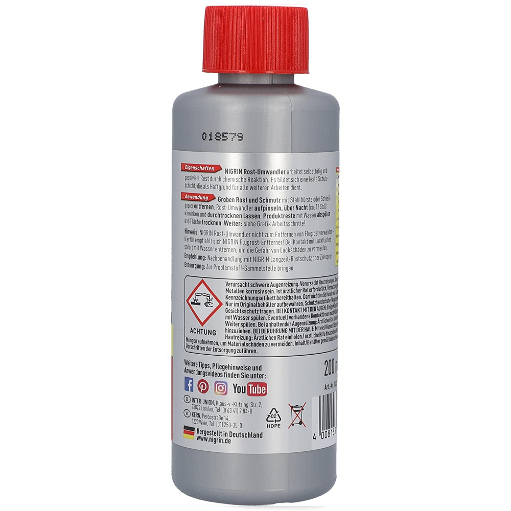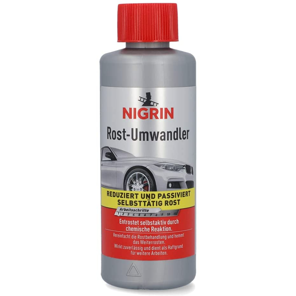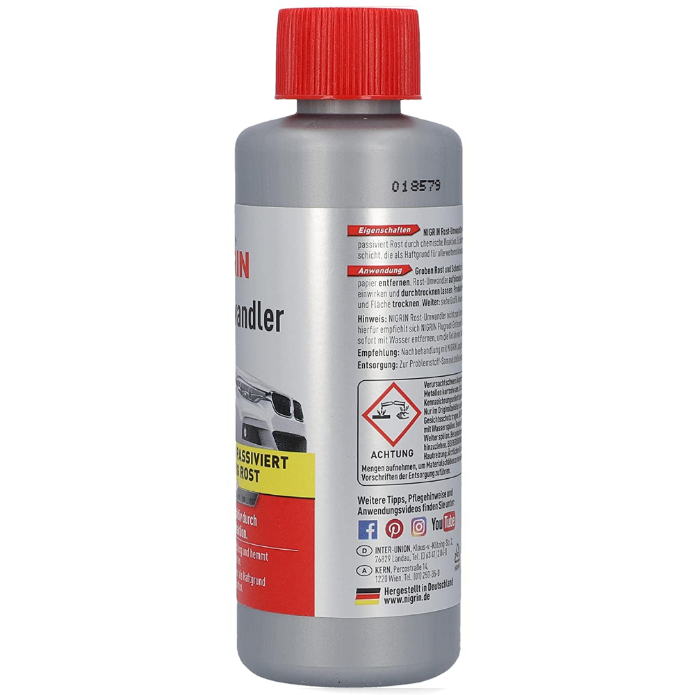 Конвертер (преобразователь) ржавчины NIGRIN снижает упрощает работу по восстановлению с ржавыми деталями, потому что он работает автоматически и пассивирует ржавчину посредством химической реакции. Не требуется трудоемкого механического удаления ржавчины. NIGRIN Rostumwandler Rust Converter работает надежно - ржавчина растворяется специальной кислотой. В результате химической реакции образуется прочный защитный слой, который защищает от кислорода и, следовательно, от дальнейшей ржавчины и служит грунтовкой для всех дальнейших работ.