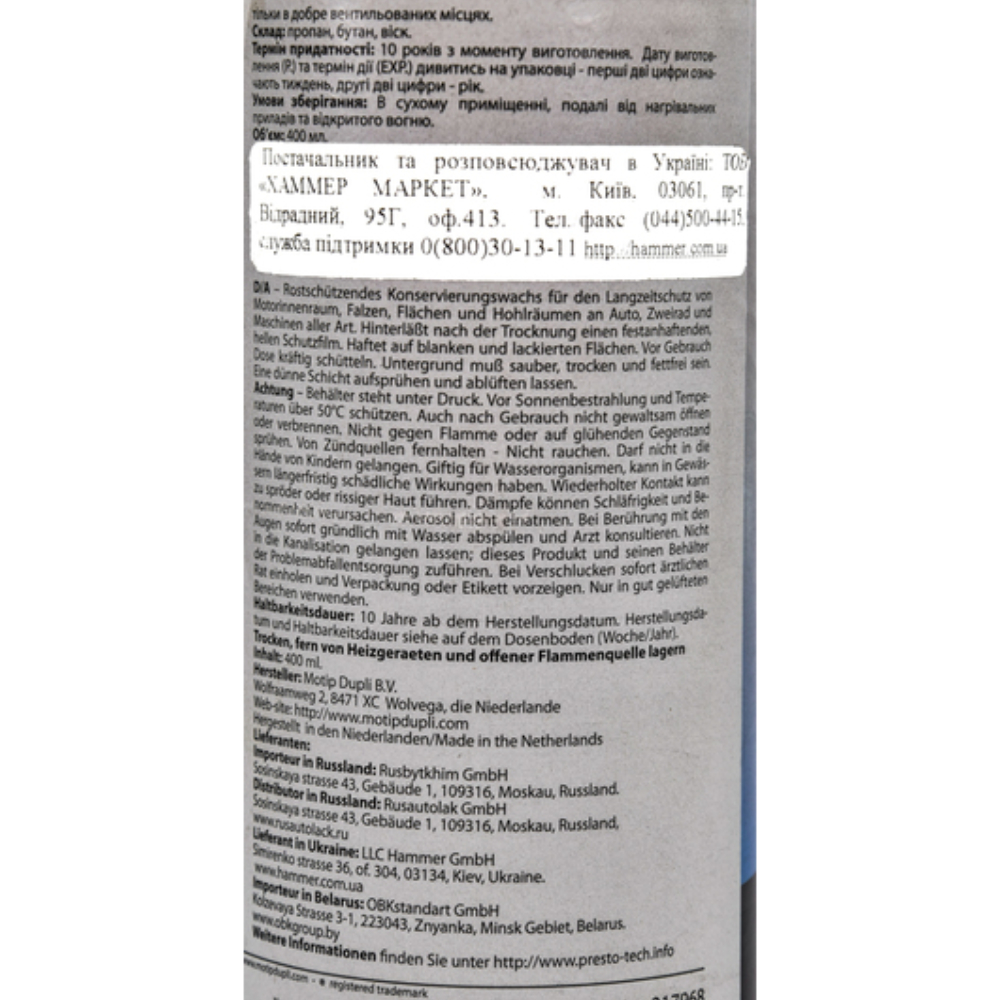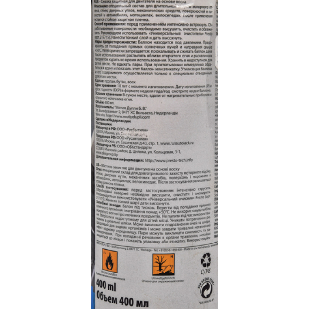 Смазка для защиты моторного отсека и трудно доступных участков авто- и мото- техники Presto Motorschutz Wachs 217968 400 мл - специальный состав для длительной защиты от коррозии моторного отсека, стоек, дверных углов, механических средств, поверхностей и полостей в автомобилях, мотоциклах, велосипедах. После применения остается стойкая защитная пленка.