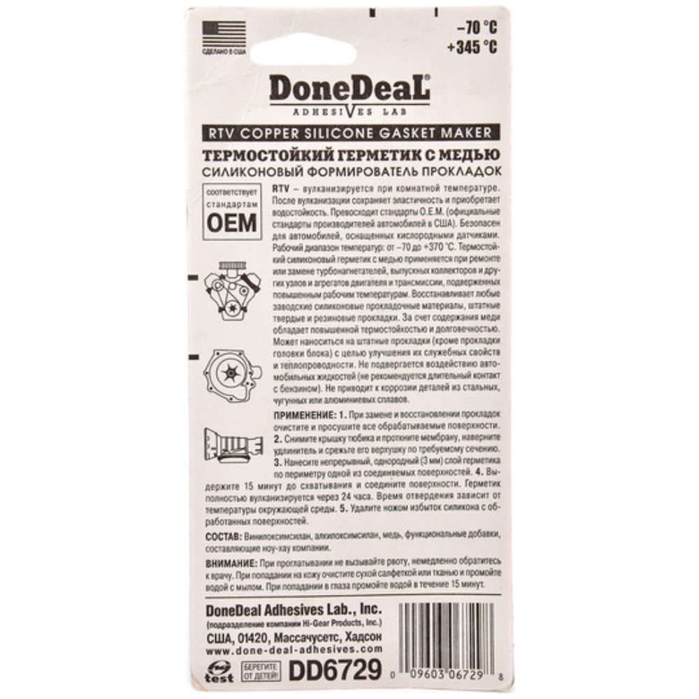Термостійкий мідний силіконовий формувач прокладок (85 г) Done Deal DD6729. Термостійкий герметик, що має підвищену термостійкість і довговічність. Застосовується для ремонту вузлів та агрегатів, що підлягають тривалій безрозбірній експлуатації та працюють в умовах підвищених температур. Термостійкий герметик-формувач прокладок силіконовий з міддю для ремонтних робіт. МЕК оксимо) силан, мідь, функціональні добавки.