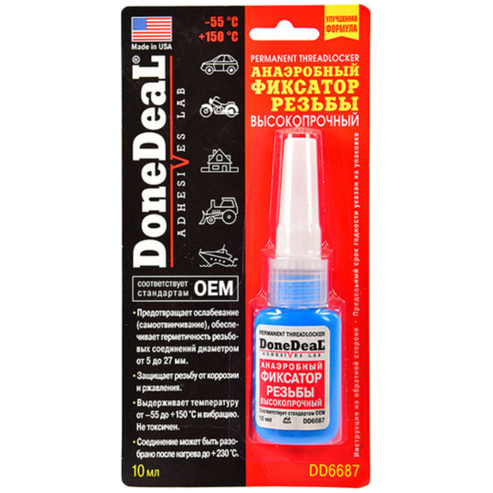 Анаеробний фіксатор різьблення високоміцний (10 г) Done Deal DD6687. DD6687 рекомендується для використання у всіх випадках, коли різьбове з'єднання має протистояти високим напругам, ударним навантаженням, вібраціям, агресивному хімічному впливу та впливу несприятливих умов при експлуатації. Анаеробний фіксатор для герметичності різьбових з'єднань від 8мм до 25мм. прозорий.