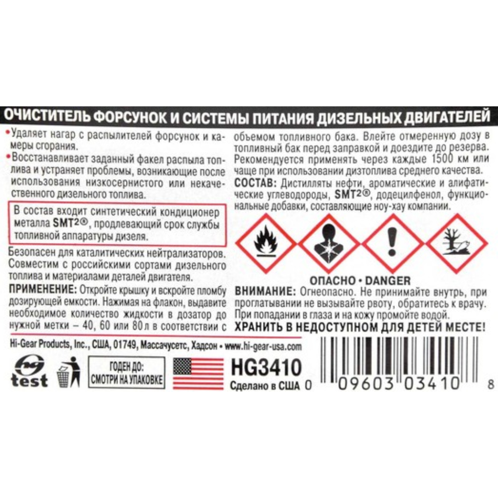 Очищувач форсунок та системи живлення Hi-Gear HG3410 також призначений для обробки дизпалива з метою забезпечення технічної чистоти форсунок дизельних двигунів та їх систем живлення