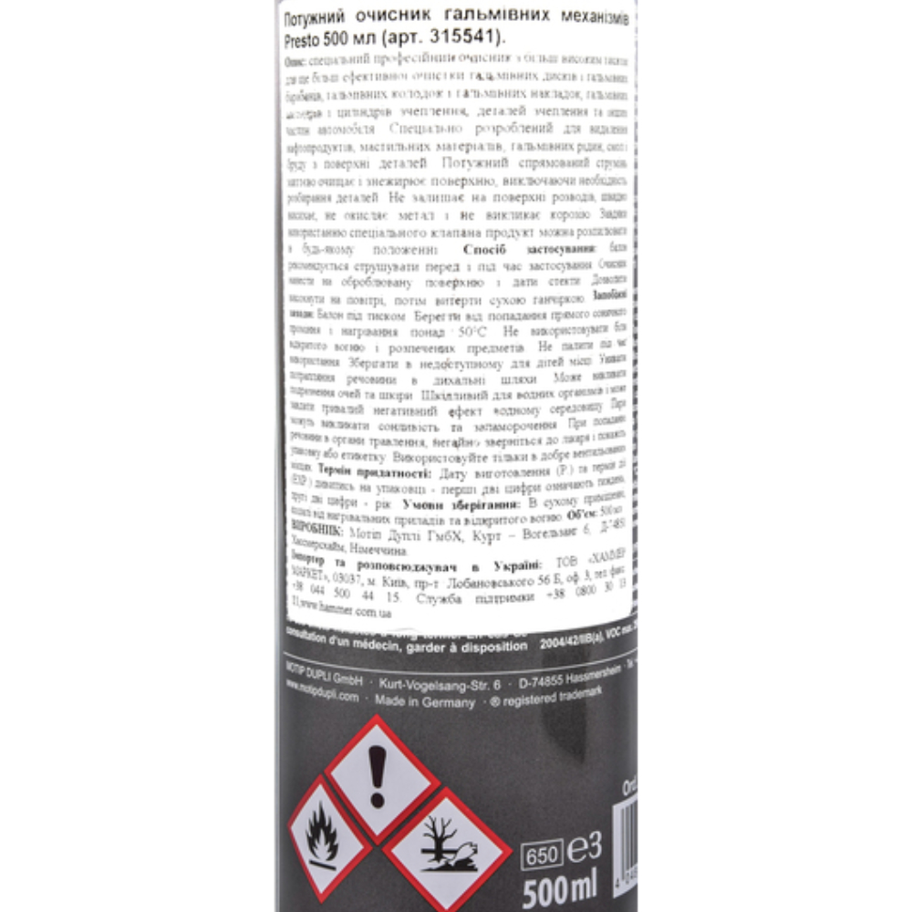 Очищувач гальмівних механізмів (гальм) Presto Bremsen Reiniger 315541 500 мл. Очищувач гальмівної системи та деталей зчеплення у зручному аерозольному флаконі для швидкого безрозбірного очищення вузлів та агрегатів від бруду. рідин, мастил та олій. Високі здібності, що очищають, дозволяють усувати навіть кислоти і продукти окислення металів. Застосування очищувача покращує роботу гальм, знижує їх нагрівання та зношування, усуває сторонні скрипи та сприяє продовженню безвідмовного терміну експлуатації. Висока проникаюча здатність очищувача Presto Power Bremsen-Reiniger 315541 дозволяє видаляти навіть застарілі забруднення, при цьому не вимагає демонтажу та розбирання механізму.