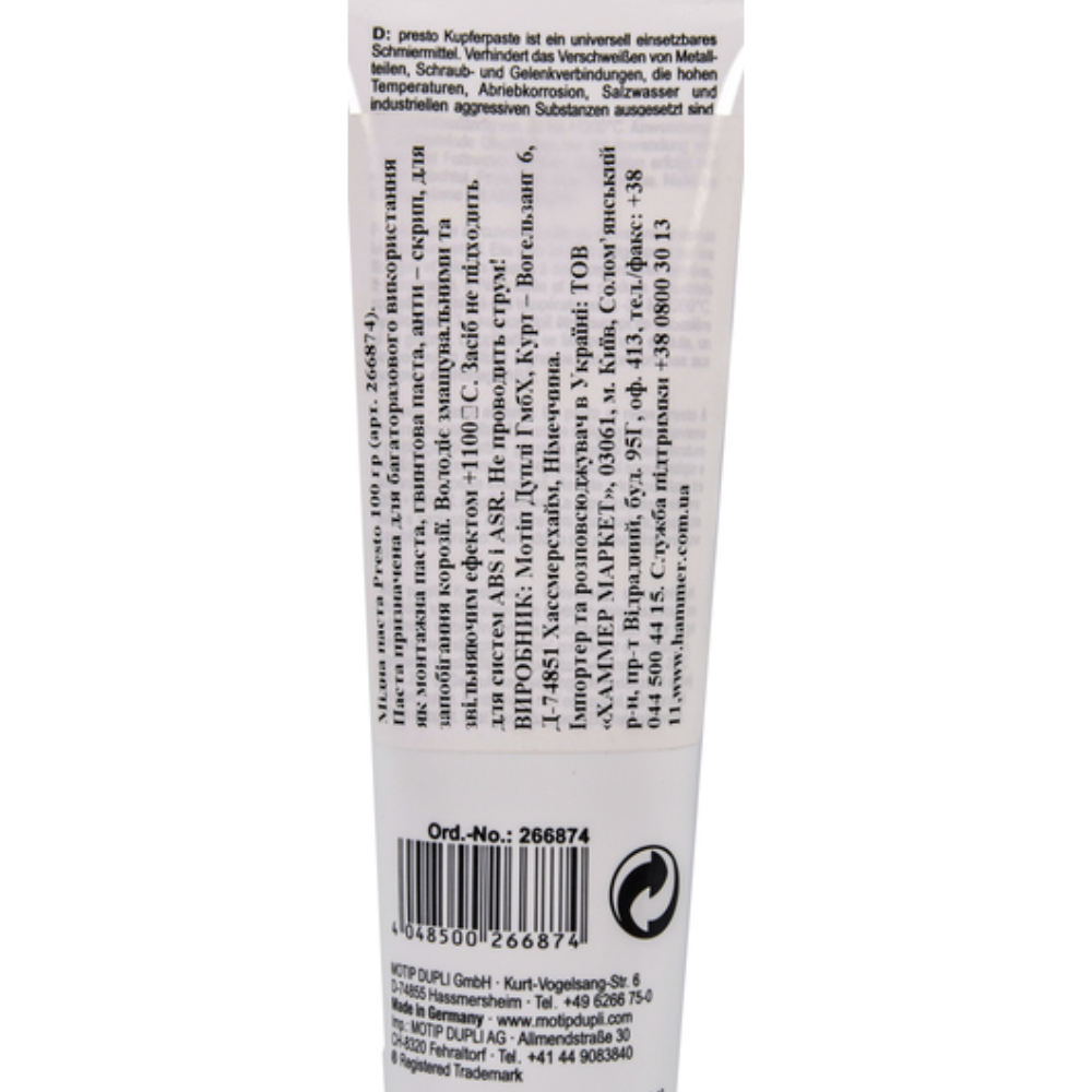 Високотемпературна мідна паста Presto Kupfer-Paste 266874 100 г - паста з високим вмістом міді. Підходить для обробки різьблення свічок запалювання, що направляють гальмівних колодок, болтів, з'єднань газовихлопного тракту та інших деталей, що працюють при високих температурах. Мідна паста Presto збільшує термін служби деталей і не дає їм заїдати. Стійка до води, слабких кислот, солей, лугів і запобігає корозії. Робочий діапазон температур: від -40°С до +1100°С.