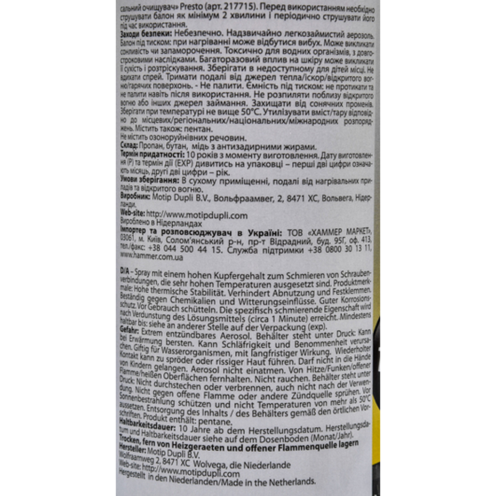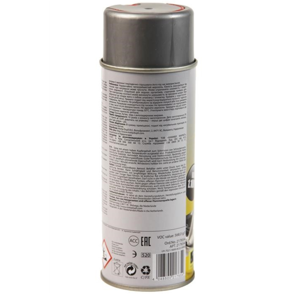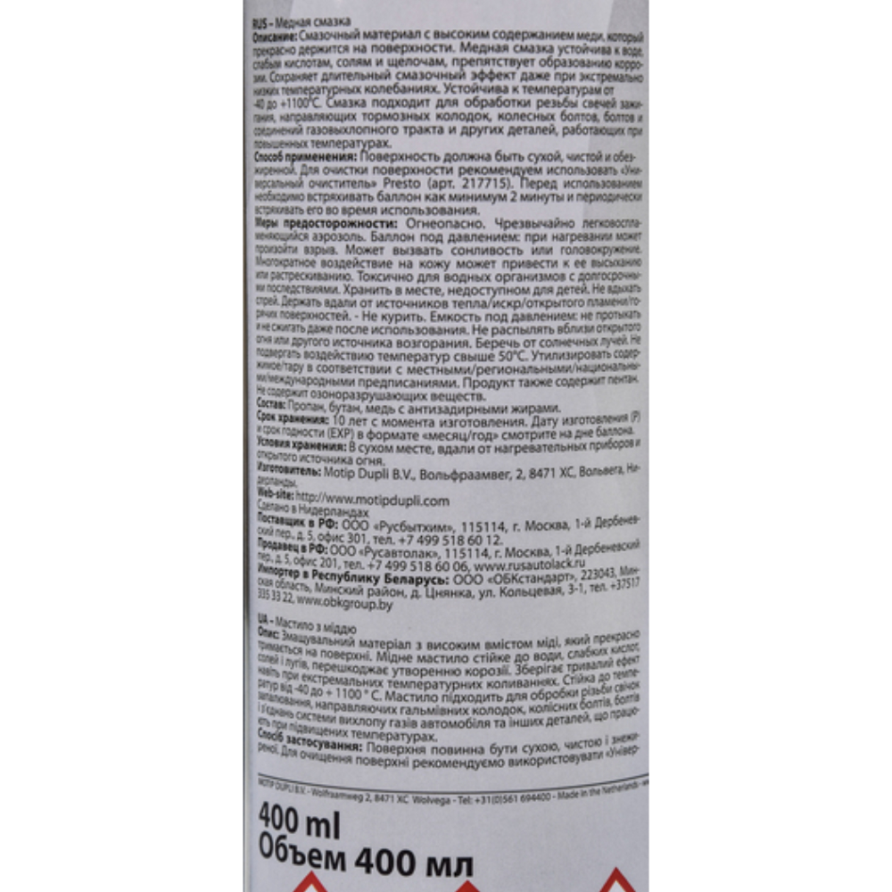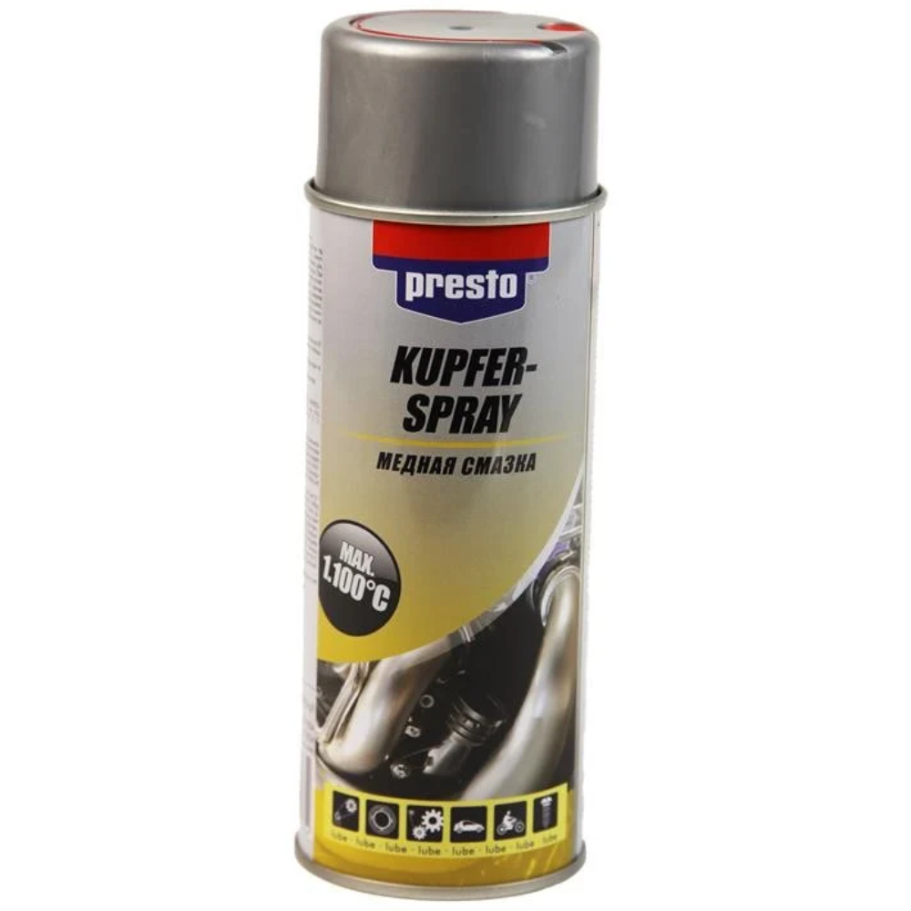 Мідне мастило із захистом від корозії Presto Kupfer Spray 217654 400 мл - мастило з високим вмістом міді. Стійка до води, слабких кислот, солей, лугів, запобігає корозії. Зберігає тривалий мастильний ефект навіть при екстремальних температурних коливаннях (від -40 ° С до +1100 ° С). Ідеальна для обробки різьблення свічок запалювання, що направляють гальмівних колодок, болтів, з'єднань газових лопного тракту та інших деталей, що працюють при підвищених температурах. Інструкція: як використовувати мідне мастило Presto