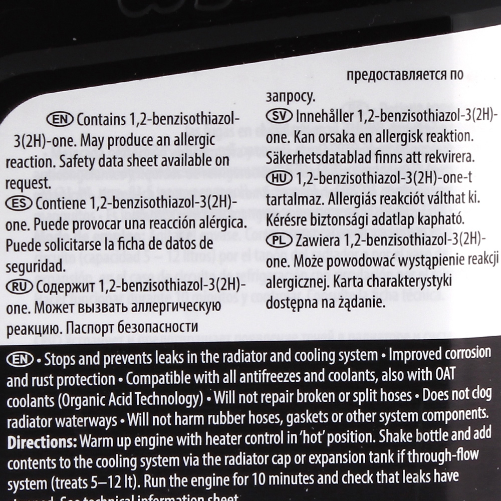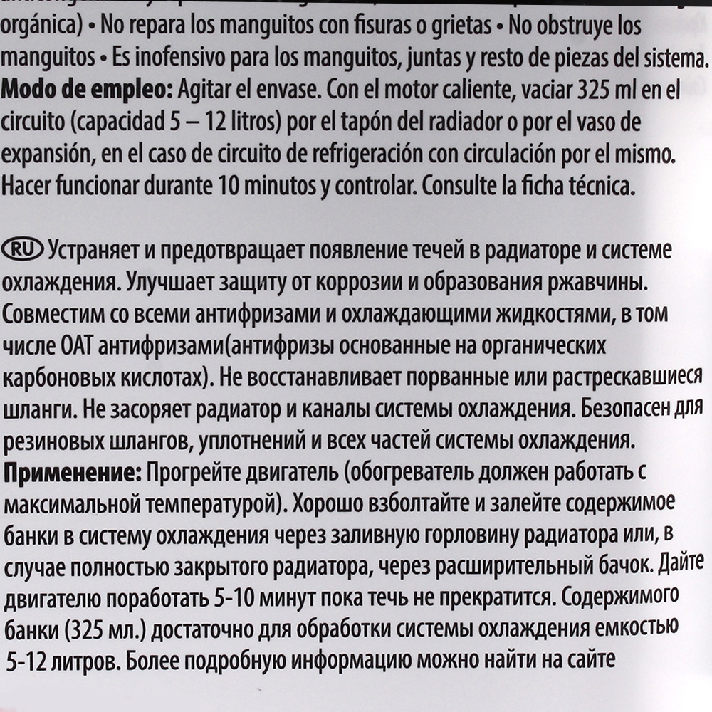 - Останавливает и предотвращает незначительные течи в радиаторе, системах охлаждения и обогрева.
